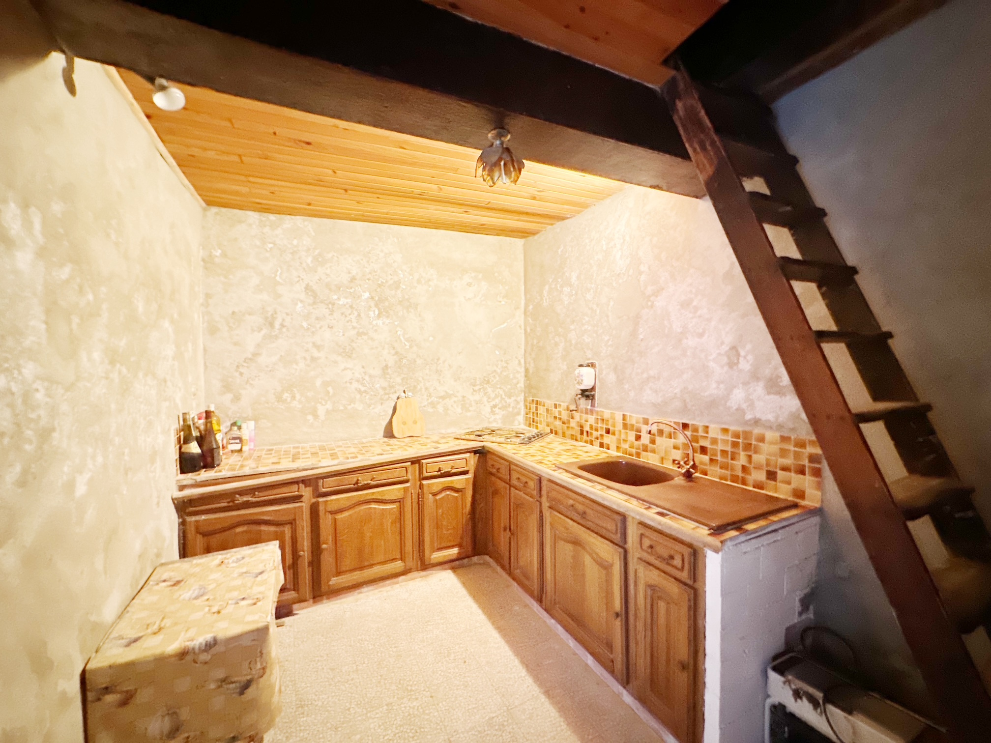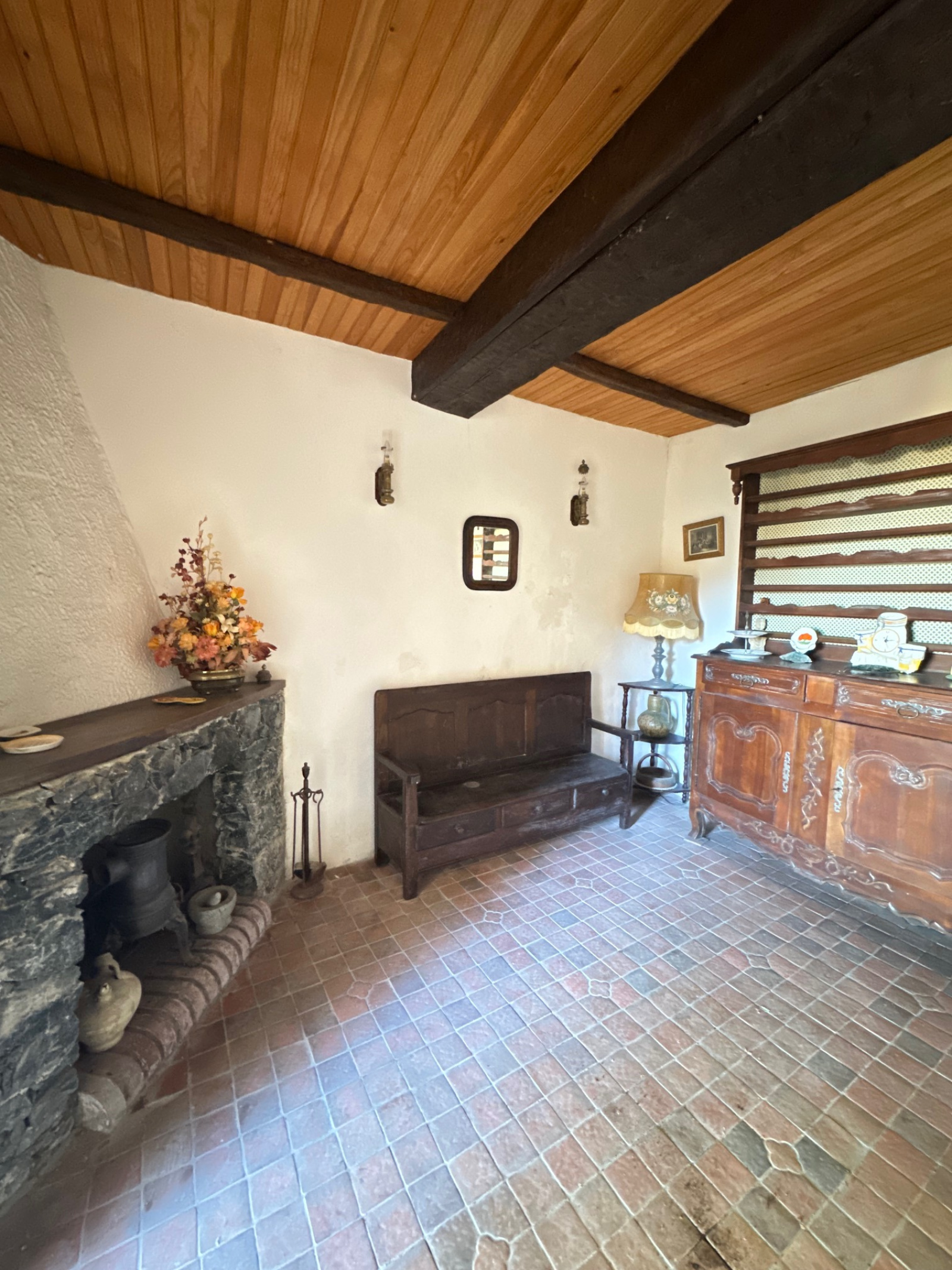 Cette maison authentique séduit par son caractère ancien et son atmosphère chaleureuse. Elle se compose d’un petit salon accueillant orné d’une cheminée en pierre et de poutres apparentes, d’une cuisine séparée, ainsi que de deux chambres à l’étage, dont l’une bénéficie d’une vue sur la mer.